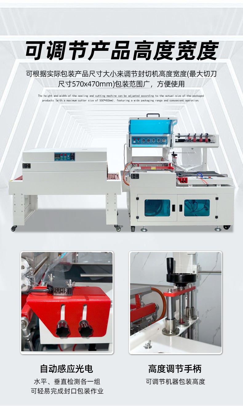 • 设备可通过调节 “输送带速度、封切温度、收缩温度”,适配不同尺寸产品(通常适用产品尺寸:长 50-600mm、宽 30-400mm、高 20-300mm),从小件(如口红、药盒)到中件(如礼盒、小家电)均可包装。