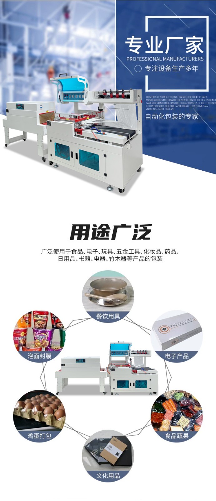 全自动 L 型封切热收缩包装机是一款集 “封切套膜” 与 “热收缩定型” 于一体的自动化包装设备,因封切机构呈 “L” 形而得名,广泛应用于食品、医药、电子、日化等行业,核心优势是包装效率高、密封性好、外观规整,能快速实现产品的单件或集合包装,尤其适配规则形状(如长方体、圆柱体)及中小型尺寸产品。下面从核心工作原理、关键结构组成、核心优势、适用场景、选型与操作注意事项五个维度,全面介绍该设备: