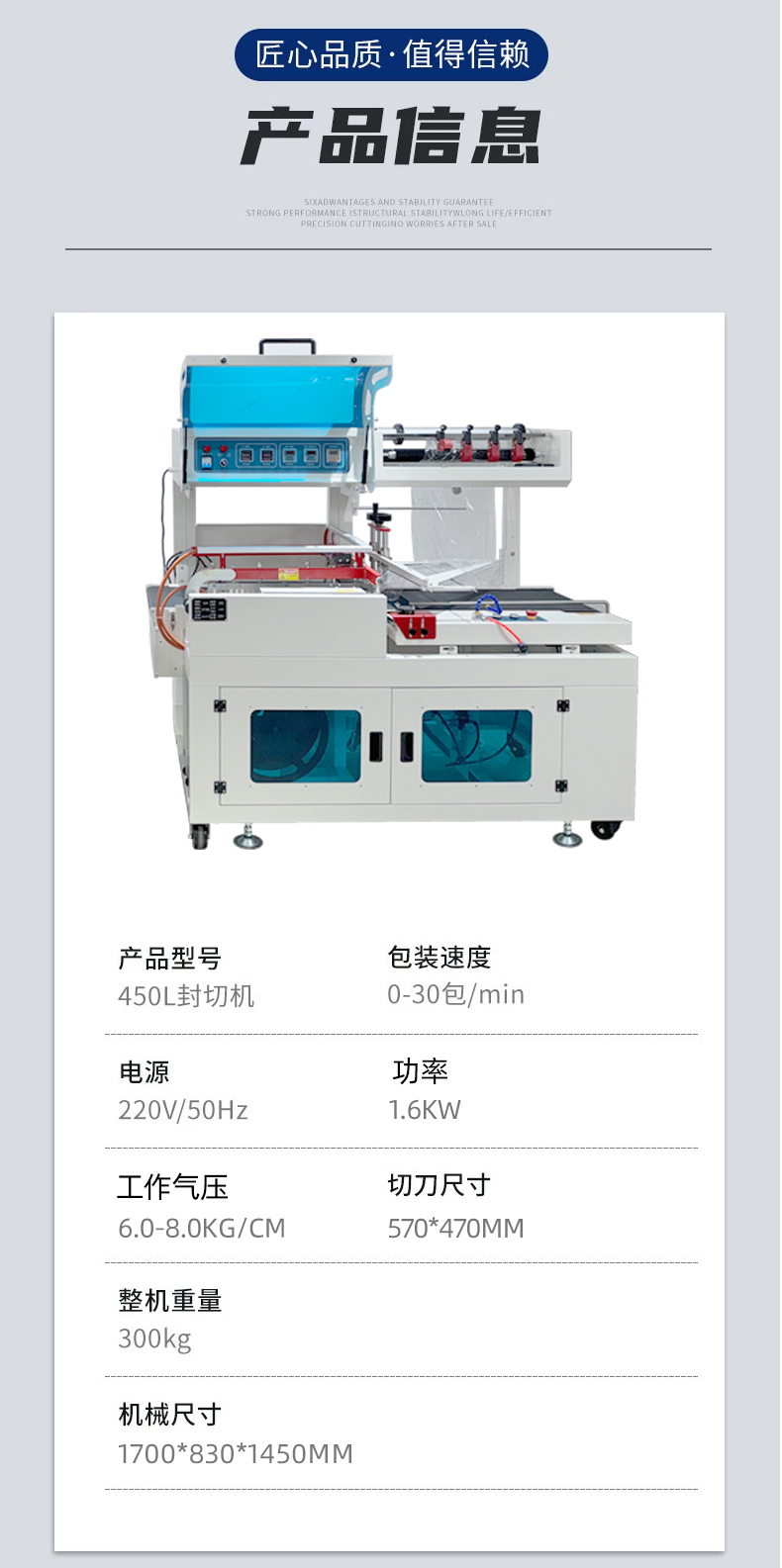 • L 型封切刀(由横向刀和纵向刀组成,呈 “L” 形)快速下压,同时通过 “热封 + 切断” 一体化动作:先通过加热条将膜的重叠处热封(形成密封的 “膜袋” 套住产品),再通过内置切刀切断多余膜料,完成 “套膜” 工序;