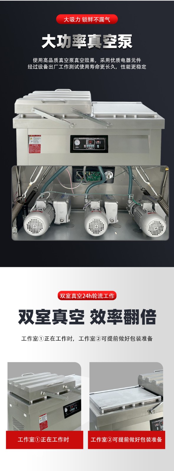 - 同时,关闭右室真空盖,设备立即切换动力至右室,启动右室的抽真空→热封→冷却→回气流程;