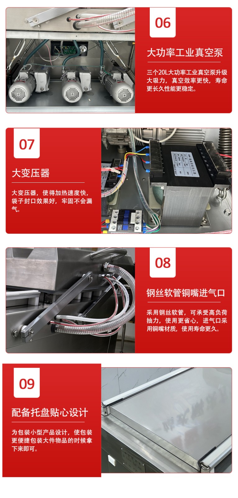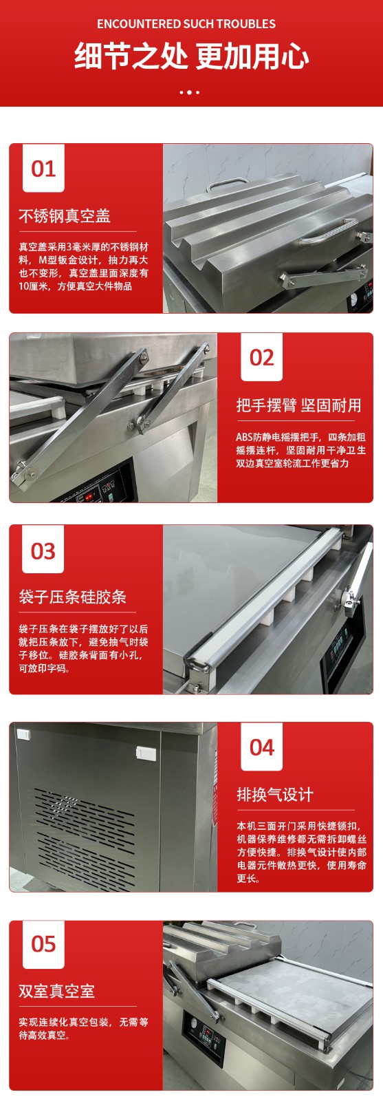 每个真空室都配有独立的热封条、冷却条和压力装置,无需共享热封组件 —— 这意味着左室热封时,右室的热封组件处于 “待命” 状态,右室启动后可直接加热,无需等待热封组件降温或预热,进一步缩短切换时间。