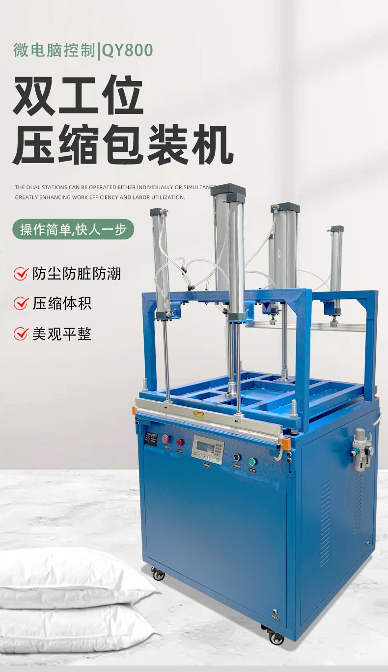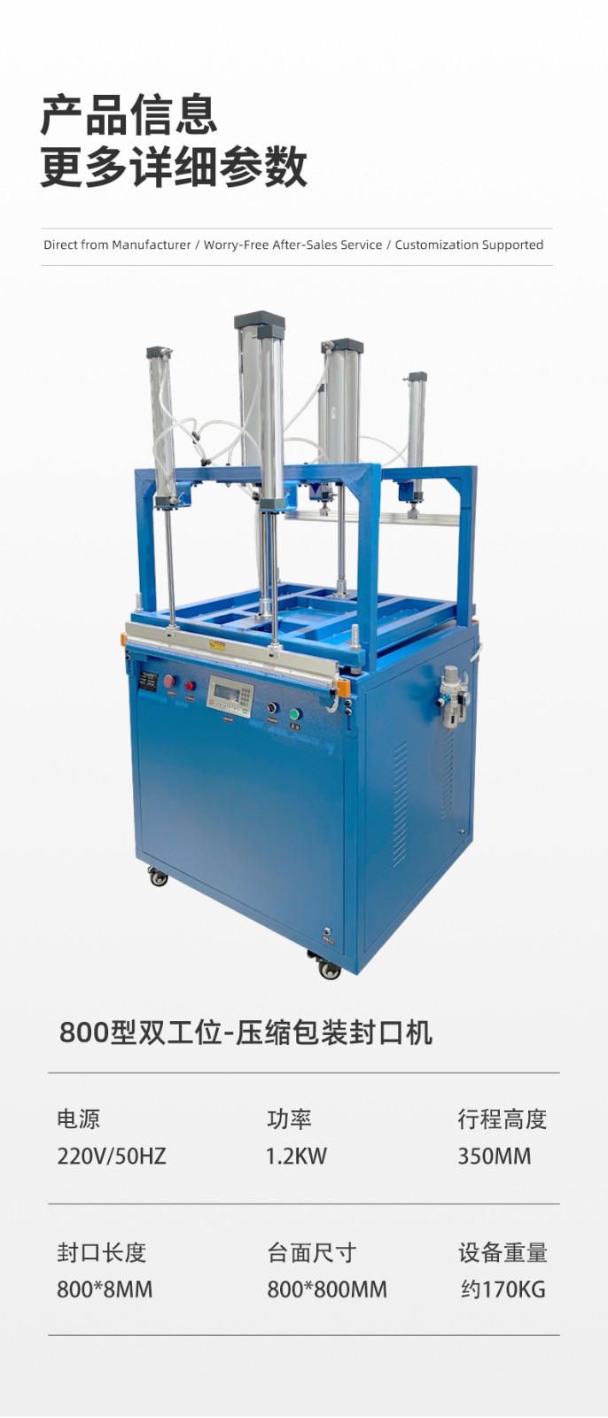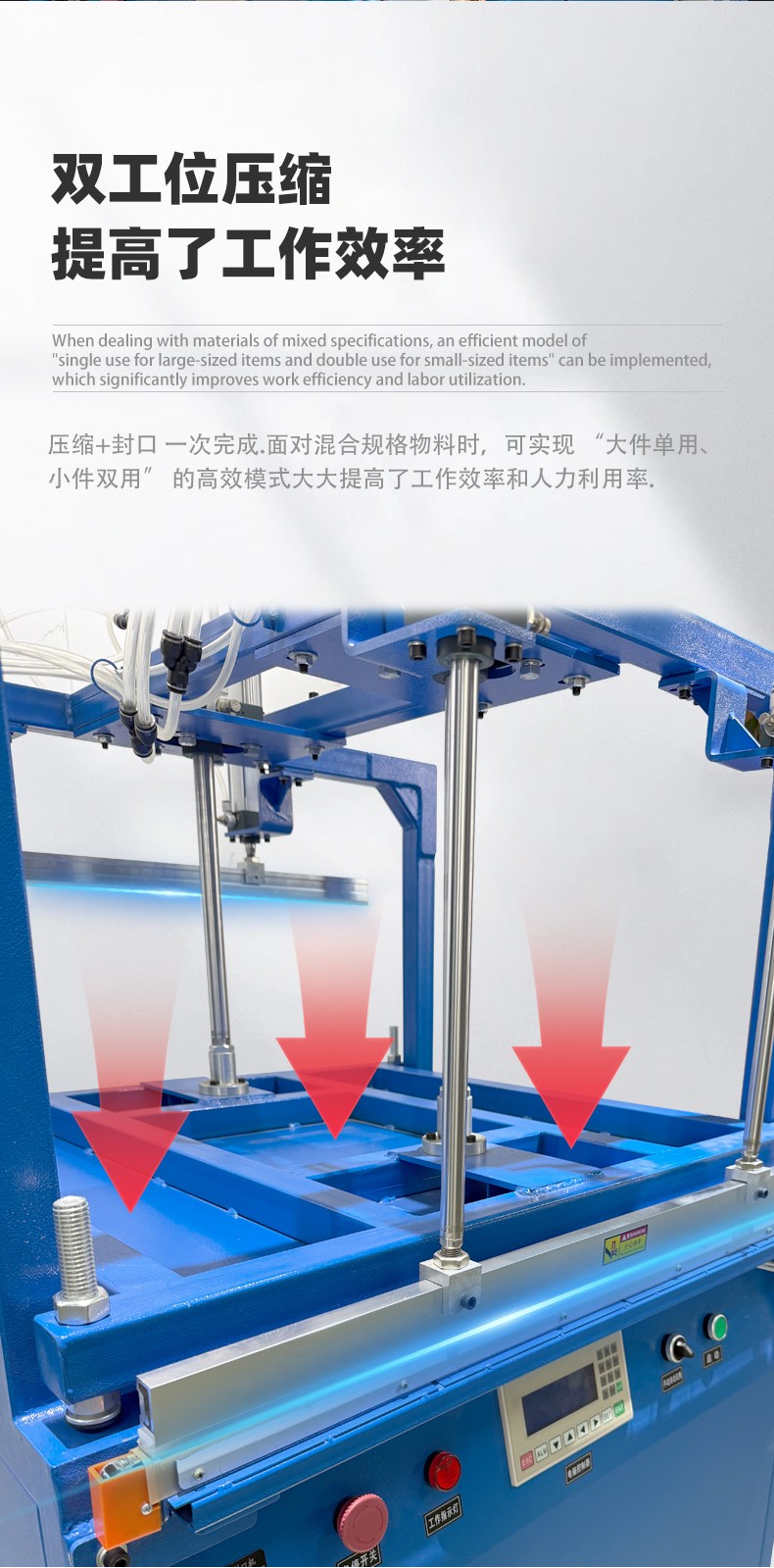 双工位压缩封口机:两个工位可同时作业,一边封口时另一个可放件 / 取件,适合中小批量、多规格产品(如多口味食品、电子元件袋),效率比单工位高 50%-80%。