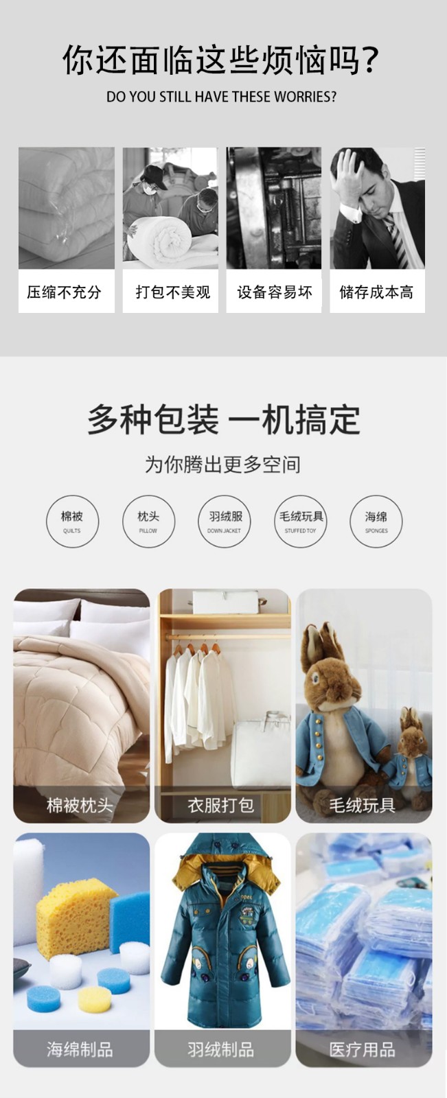 真空压缩封口机:集成抽真空功能,先抽走包装内空气(如食品袋、零件袋),再加压封口,适合需要防潮、保鲜、防氧化的场景(如肉类真空包装、精密零件防锈包装)。