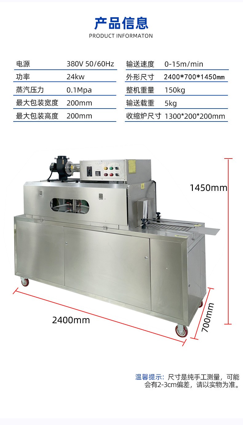 - 智能控温,适配多类膜材配备 PLC 智能控制系统,可精准调节蒸汽温度(50℃-120℃可调)、输送速度与蒸汽喷射量,兼容 POF、PVC、PE 等多种热收缩膜材,满足不同产品的包装厚度与质感要求。